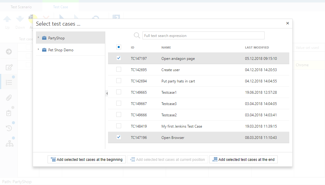 A dialogue opens in which you see all test cases in the project. You can either search for a specific test case or use one of your predefined filters. When you select a test case you can choose whether to add it at the beginning or at the end of the test scenario. After adding all desired test cases you can save your scenario.