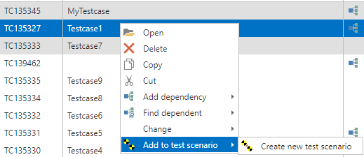 Alternatively you can directly create a new test scenario by selecting a set of test cases in the element browser of the navigatio window. Then, right-click the selected ones and choose Create new test scenario.