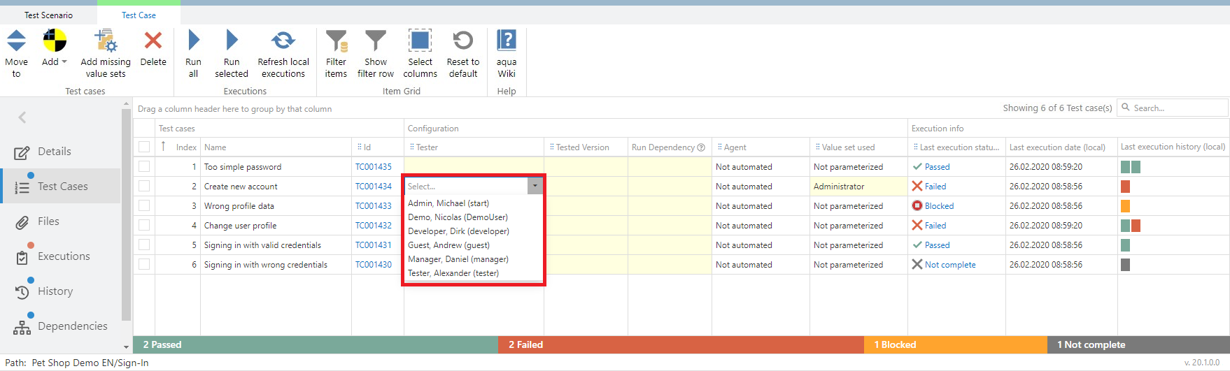 You can assign a tester to each test case in the context of the scenario. Please note, that you are not overwriting the assignee from the test case. In order to assign a tester to a test case in the scenario, click in the empty cell under the column 'Tester'. A dropdown will appear, where you can select a colleague, which is assigned to the current project. If the selected Tester corresponds to the current user, the name will be shown in bold.