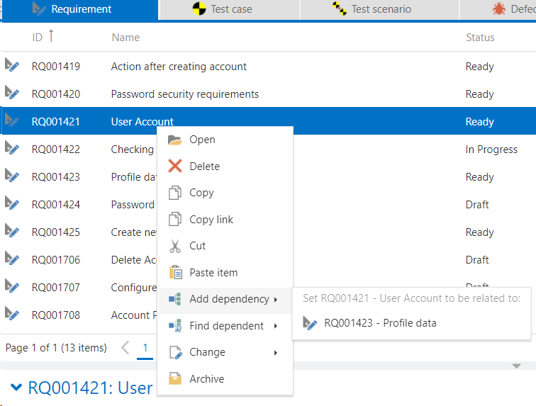 In addition to automatically created dependencies, e.g. when a defect is created from a test case execution, you can create further dependencies from the selected item to any other existing item. To do this, click on an item type from the Set Dependency section. Here you have an overview of all items of this type in the project and can narrow down the view even further by selecting a folder on the left or by entering a search term in the search line. You can then use the Link items button (Link test cases, Link defects etc.) to link the desired items. You can also define a dependency type.