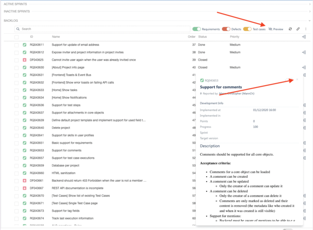 Quick preview of items on backlog page and scrum board.