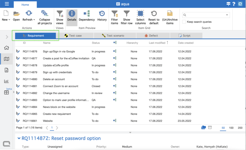 The ‘Requirement coverage’ status appears when at least one test case or test scenario is
