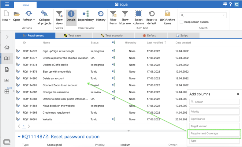 status, then right-click on the ‘Requirement coverage’ column and choose the option