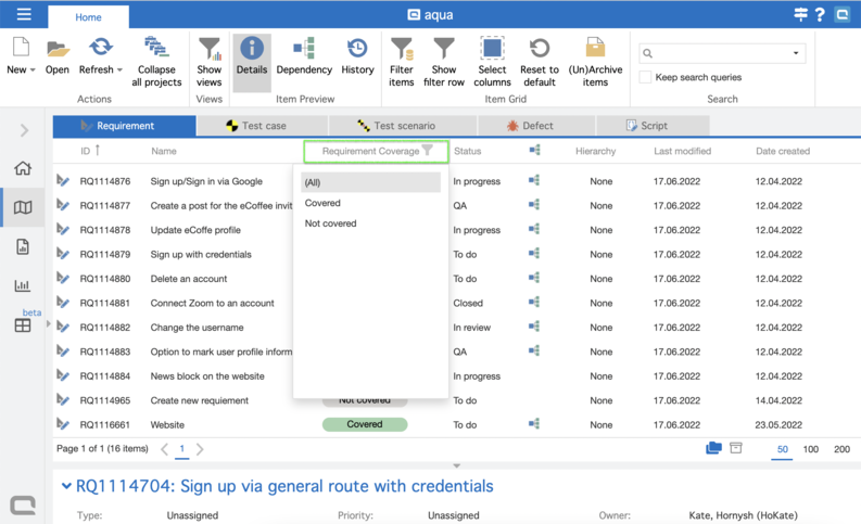 Step 4: Hover the column ‘Requirement coverage’ and click on the ‘Filter’ icon. When the