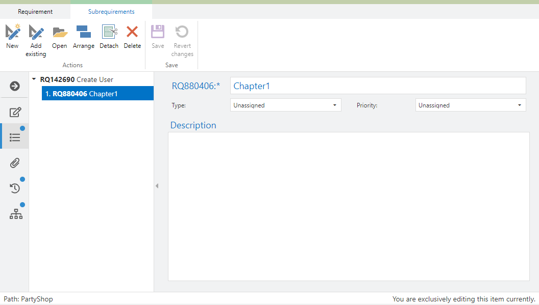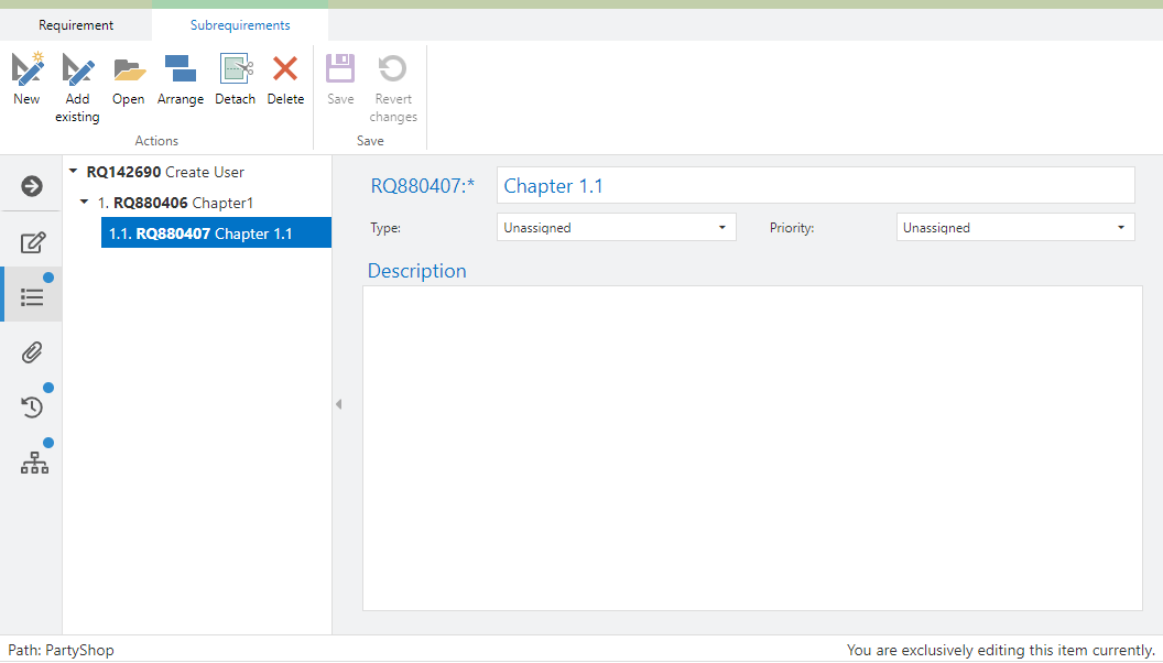 If you want to edit these subrequirements, select them from the list on the left. The hierarchy can be changed using . You can also Detach the selected sub-requirement from the hierarchy, Delete it completely or Open it in a new window.
