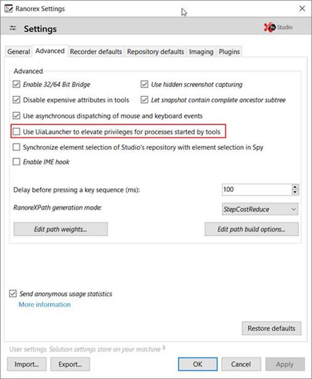 Ranorex starts with elevated rights per default. If you do not use aqua with elevated rights, this might lead to unexpected behaviour. To avoid this, open the settings of your ranorex studio and deactivate the following option: